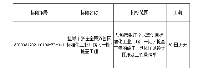 本招標項目鹽城市張莊全民雙創(chuàng)園標準化工業(yè)廠房已由鹽城市鹽都區(qū)發(fā)展和改革委員會以關(guān)于鹽城市張莊全民雙創(chuàng)園建設投資有限公司建設張莊全民雙創(chuàng)園標準化工業(yè)廠房項目備案的通知-都發(fā)改審(2016)281號批準建設。招標人為鹽城市張莊全民雙創(chuàng)園建設投資有限公司,工程所需資金來源自籌。項目已具備招標條件,現(xiàn)對該項目的鹽城市張莊全民雙創(chuàng)園標準化工業(yè)廠房(一期)樁基工程進行公開招標。本次招標對投標報名人的資格審查,采用資格后審方法選擇合格的投標申請人參加投標。