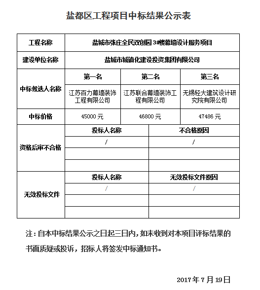 鹽城市張莊全民雙創(chuàng)園3#樓幕墻設(shè)計(jì)服務(wù)項(xiàng)目中標(biāo)結(jié)果公示