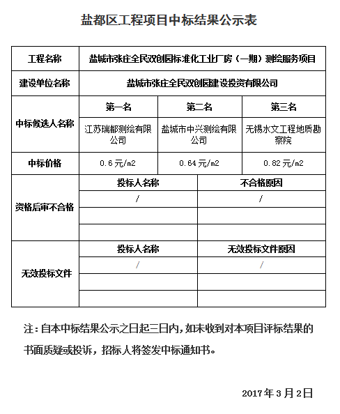 鹽城市張莊全民雙創(chuàng)園標(biāo)準化工業(yè)廠房(一期)測繪服務(wù)項目中標(biāo)公示