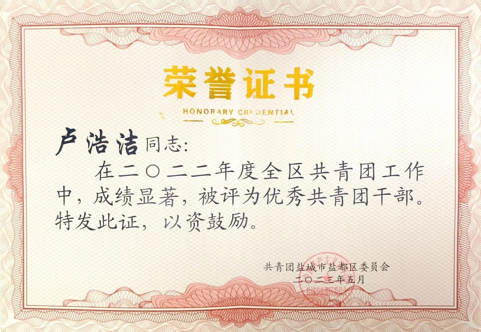 集團(tuán)團(tuán)委書記獲共青團(tuán)鹽城市鹽都區(qū)委表彰