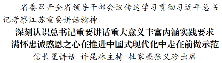 信長星指出,習(xí)近平總書記考察江蘇重要講話,統(tǒng)攬全局、指航定向,言近旨遠、語重心長,是強國建設(shè)、民族復(fù)興宏偉藍圖在江蘇的具體化。要深刻領(lǐng)會總書記對江蘇一系列重要講話重要指示,在追根溯源中厘清脈絡(luò),在融會貫通中掌握要義,在一體落實中求取實效,做到學(xué)習(xí)貫徹更加全面、更加系統(tǒng)、更加深入。要深刻領(lǐng)會總書記對江蘇工作的勉勵,提高政治站位,保持清醒頭腦,堅定信心決心,把已經(jīng)取得的成績作為新的起跑線,持續(xù)補短板、強弱項、固底板、揚優(yōu)勢,用實實在在的發(fā)展成果實現(xiàn)更大突破、增創(chuàng)新的優(yōu)勢。要深刻領(lǐng)會總書記對江蘇明確的重大定位,把握“走在前、做示范”的豐富內(nèi)涵,知重負重、擔(dān)當(dāng)作為,在中國式現(xiàn)代化道路上勇于率先實踐、積累經(jīng)驗。要深刻領(lǐng)會總書記對江蘇工作提出的重大任務(wù),“四個新”既著眼中國式現(xiàn)代化戰(zhàn)略全局,又體現(xiàn)江蘇的基礎(chǔ)、優(yōu)勢和地位,是對江蘇工作要求的再明確、再拓展、再深化,必須逐條認真領(lǐng)會、深入調(diào)查研究,謀深謀實、落細落成。要深刻領(lǐng)會總書記對主題教育提出的最新要求,匡正干的導(dǎo)向、增強干的動力、形成干的合力,凝心聚力促發(fā)展,乘勢而上開新局,推動高質(zhì)量發(fā)展和現(xiàn)代化建設(shè)邁上新臺階、展現(xiàn)新氣象。
